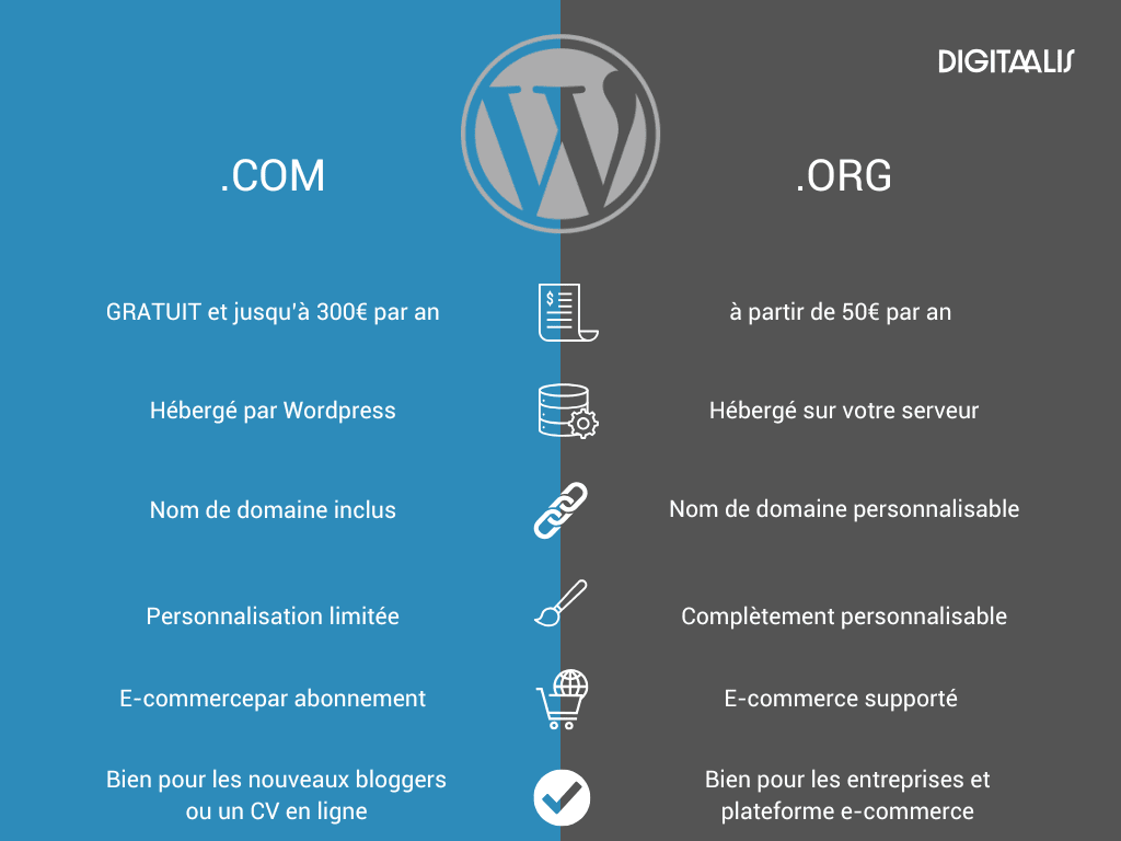 Quand les professionnels parlent de WordPress, ils parlent de WordPress.org. C’est celui que nous utilisons chez Digitaalis pour nos clients TPE/PME.