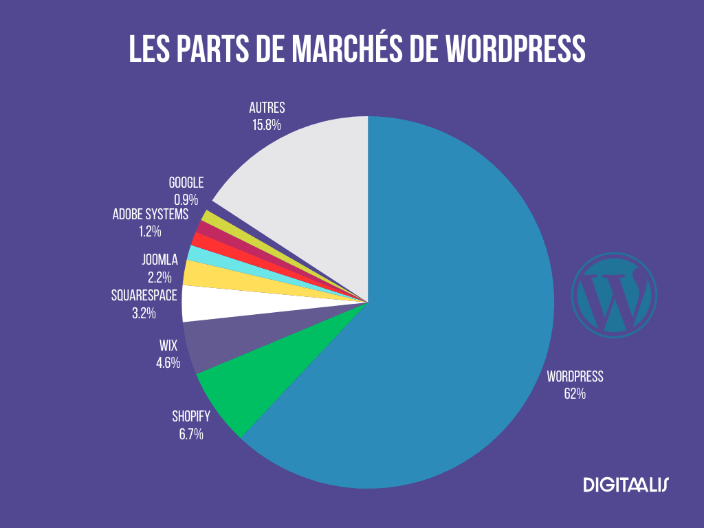 62 à 65 % de part de marché des CMS selon W3Techs et WPBeginner. Son concurrent le plus proche, Shopify, plafonne à 4,5 %. WordPress est 22 fois plus populaire que Wix, malgré les dizaines de millions que cette dernière dépense en publicité.